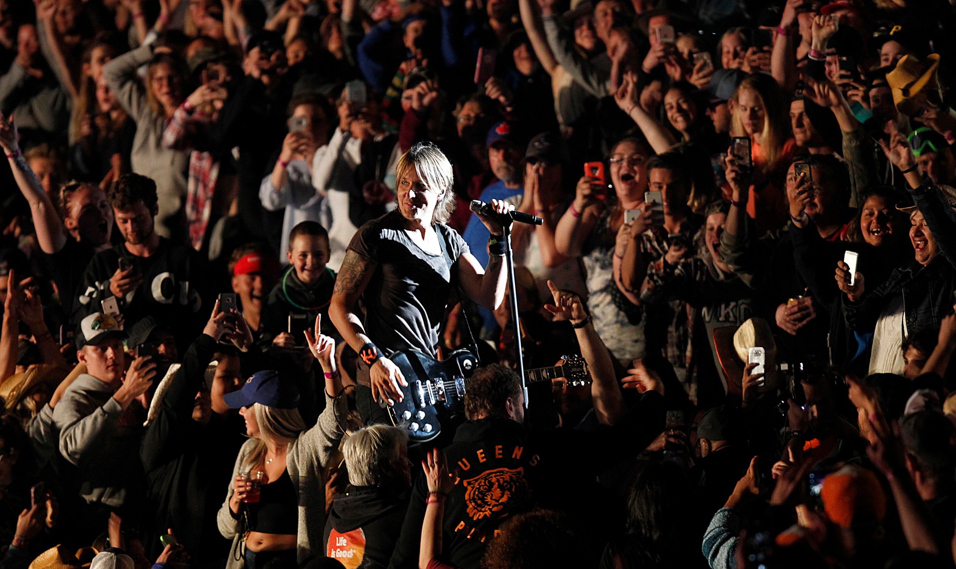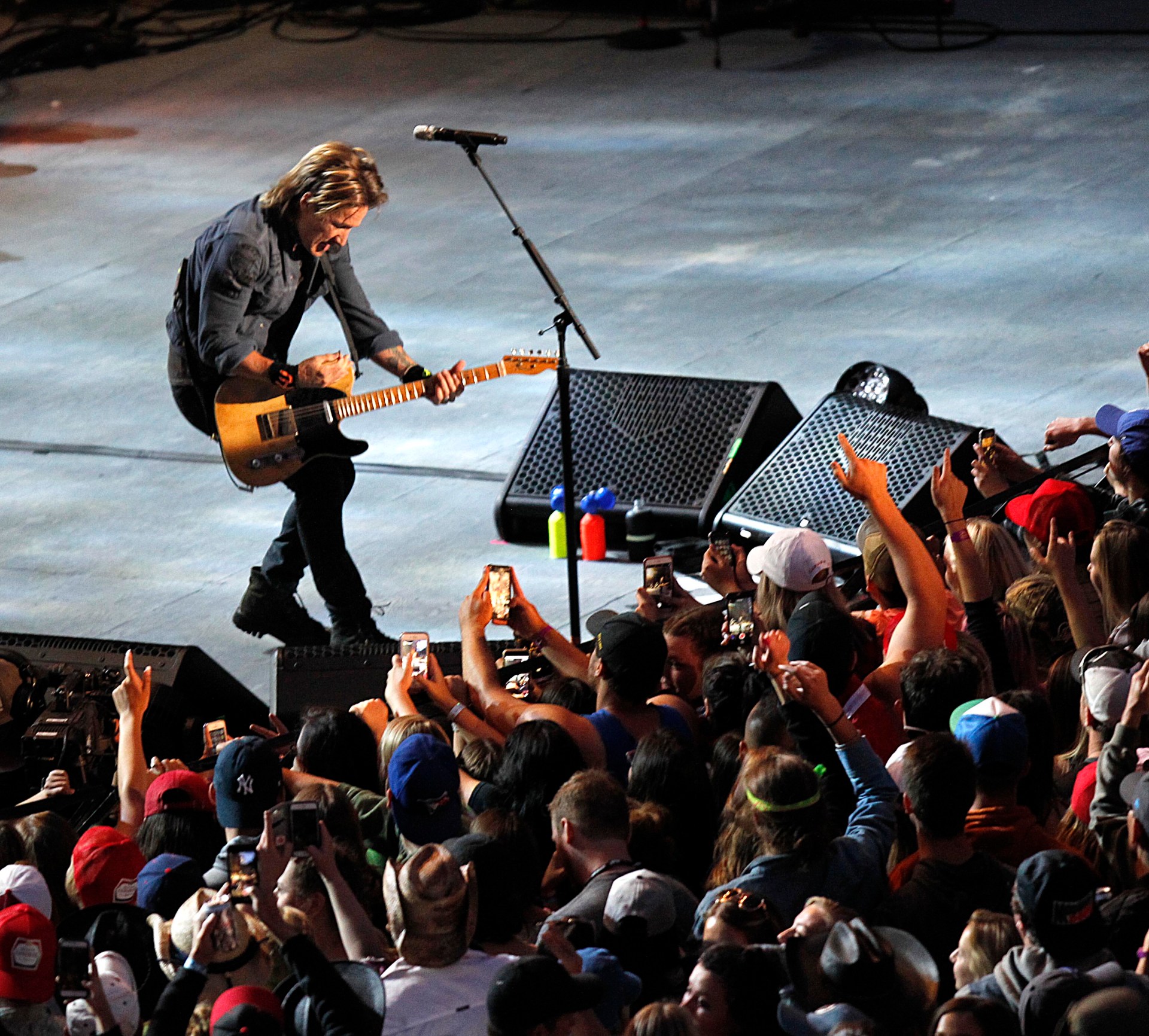 An even more impressive road crew feat followed when Urban left the stage and scrambled through the jam-packed mosh pit to make his way to a microphone halfway up the hill, providing those in the cheap seats a good glimpse of his handsome Australian looks.