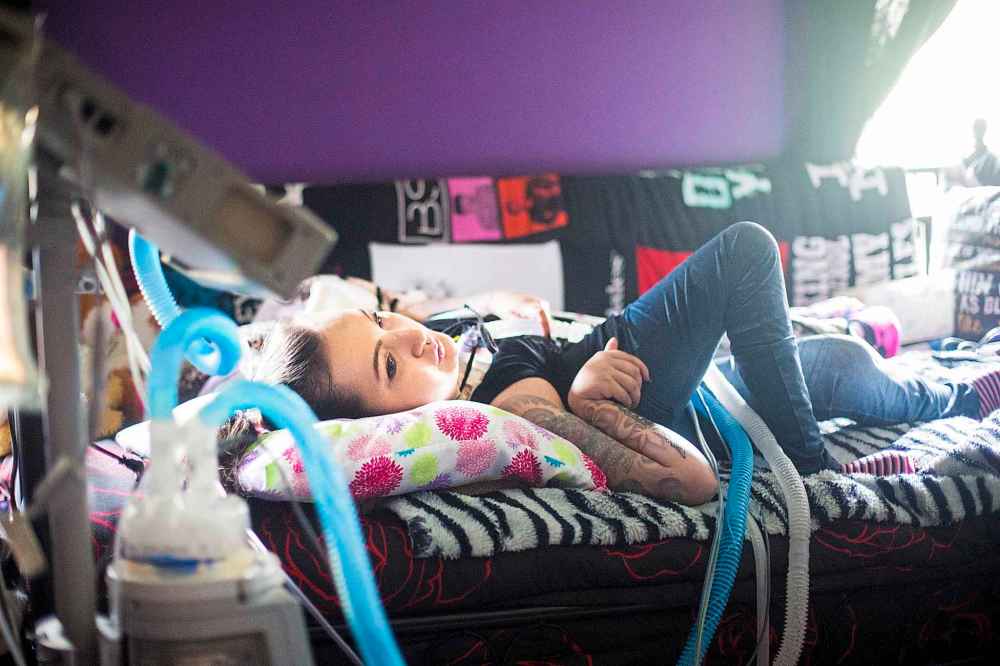 Now 29, she is nearing the end of her life and is on a ventilator at her home in St. Andrews. At the moment, her hair is sleek and brown, but it’s often dyed in electric hues. Her body is covered in tattoos, many of which act as daily reminders of friends who’ve died. “Twenty-seven friends,” she says.