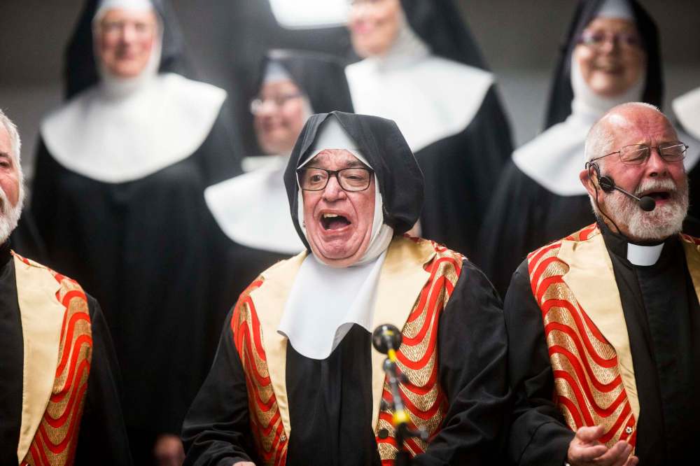 “We also have one fellow, Marcel St. Jacques, who performs a serious gospel song, One Pair of Hands. Almost without fail, every time he sings it we look out into the crowd and see somebody reaching for a Kleenex, somebody who holds that song dear,” she says, pointing out male members who sport facial hair wear a priest’s cassock versus a nun’s gown, to avoid appearing sacrilegious.