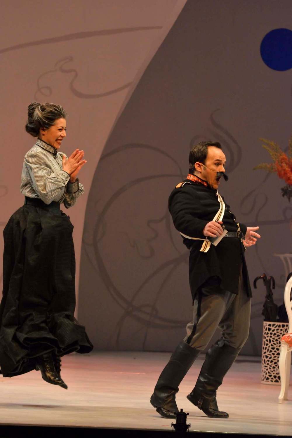 A recurring visual leitmotif of umbrellas, held aloft and twirled at strategic points (mostly) by an all-male Manitoba Opera Chorus (prepared by Tadeusz Biernacki) creates a fascinating counterpoint to the voices, as well as fetching eye-candy, especially during the opening tableau. Pure magic is also created (warning: spoiler alert) during Act I’s final chorus Mi par d’esser con la testa when the policemen’s “bayonets” morph into brollies. However, despite the tightly synchronized choreography, this clever idea became too much of a good thing as overly fussy stage business, pulling focus from the leads also gamely navigating their own props.