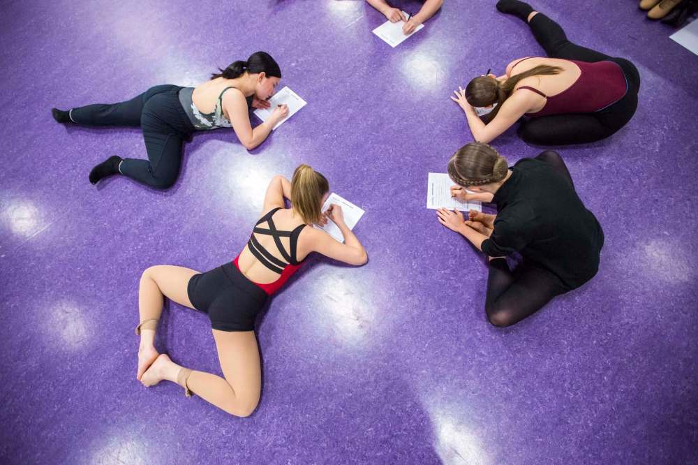 MIKAELA MACKENZIE / WINNIPEG FREE PRESS Dancers Annika McCabe (left), Haley Myers, Karissa Bowden, and Shannon Ward fill out the forms for auditions with Norwegian Cruise Lines.