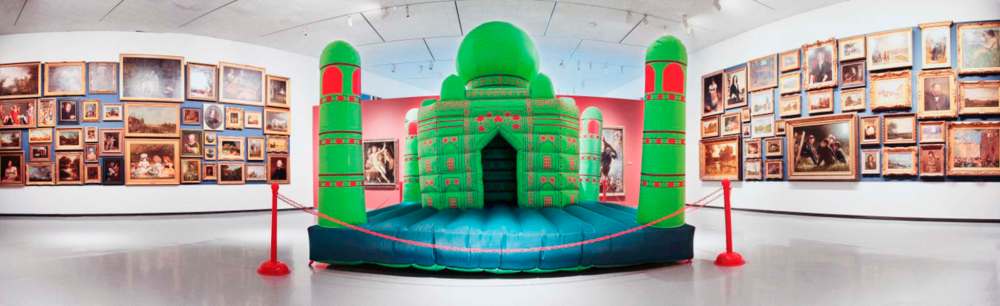 A reimagining of the Taj Mahal — the 17th century marble mausoleum in Agra — as a green, inflatable bouncy castle, the 4.5-metre tall structure has been installed in the WAG’s historical salon amid gilt-framed paintings by mostly white European male artists.