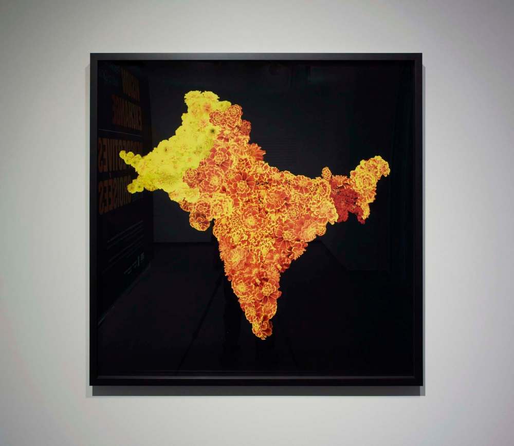 “Here’s a perfect example,” Borys continues, gesturing at Sarindar Dhaliwal’s striking The cartographer’s mistake: the Radcliffe Line, a vivid marigold map of the Indian subcontinent created by the Punjab-born artist, who now lives in Toronto.