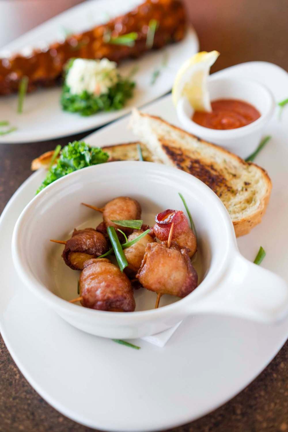 An appetizer of bacon-wrapped scallops could have been served by Mad Men’s Betty Draper, but it still tastes swell today. The scallops are cooked right — not overdone, as they might have been back in 1957 — and the accompanying cocktail sauce gets zinged up with lots of horseradish.
