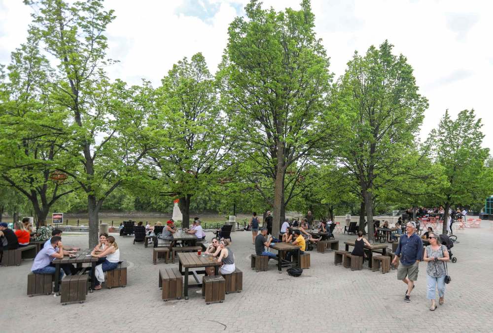 There’s no question that the buzziest new patio in town is the sprawling space at The Forks, where practically every seat has a river view. The concept basically takes all the amenities of the Common, the indoor market and bar, outside, with a licensed area stretching all the way down the first set of stairs leading to the water. It can seat 250 at bistro tables for two, chunky wooden communal tables that seat 10, and low-slung Adirondack chairs.