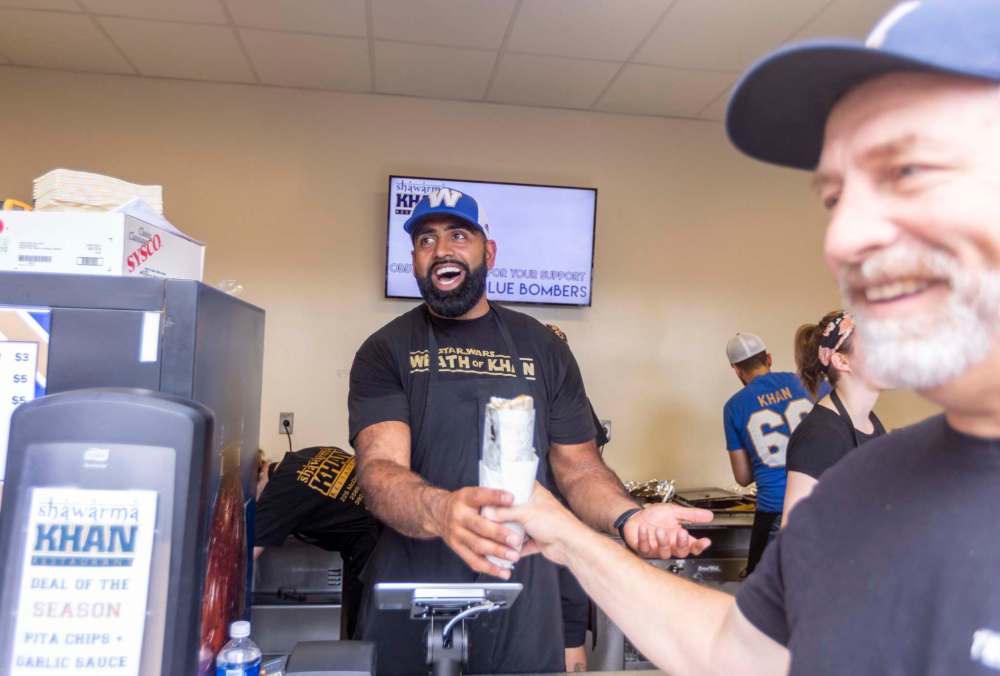 The morning after a Winnipeg Blue Bombers home game — a resounding win over the visiting Toronto Argonauts — Khan is seated in his flagship Shawarma Khan location in the Exchange District, piecing together the last 24 hours.