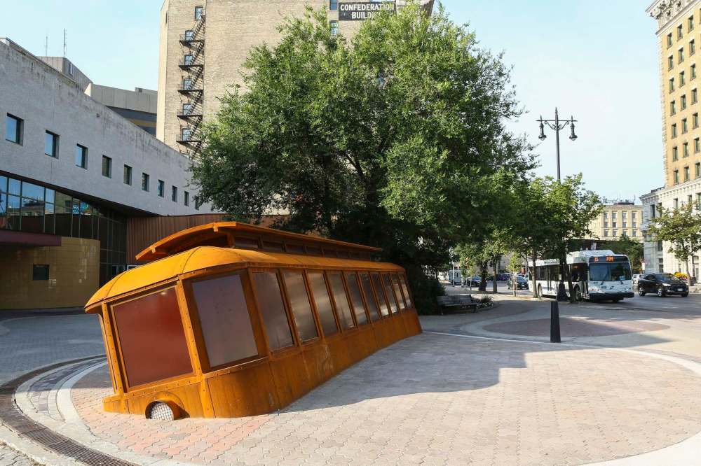 Set in the plaza in front of Pantages Playhouse Theatre, at the corner of Main Street and Market Avenue, it’s a replica streetcar — almost 10 metres long, 2.4 metres wide, and 3.7 metres tall — made of weathering steel, stainless steel and glass (weathering steel reacts with the elements to create a orange, rust-like patina). Lit from within and with a working headlamp, it’s sunk in the concrete at a permanent angle that echoes photographer L.B. Foote’s famous black-and-white image of the tilted car.