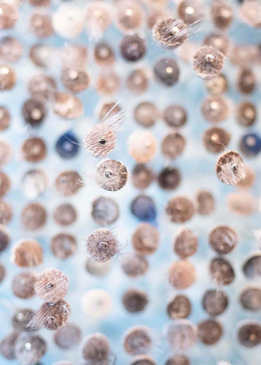 “I didn’t want to throw the scraps out,” she says. “We don’t waste material. It’s too precious to throw out. I was trying to think of a way to utilize the scraps and thought of when you punch holes in paper and make confetti. I thought I’d try that with the sealskin.”
