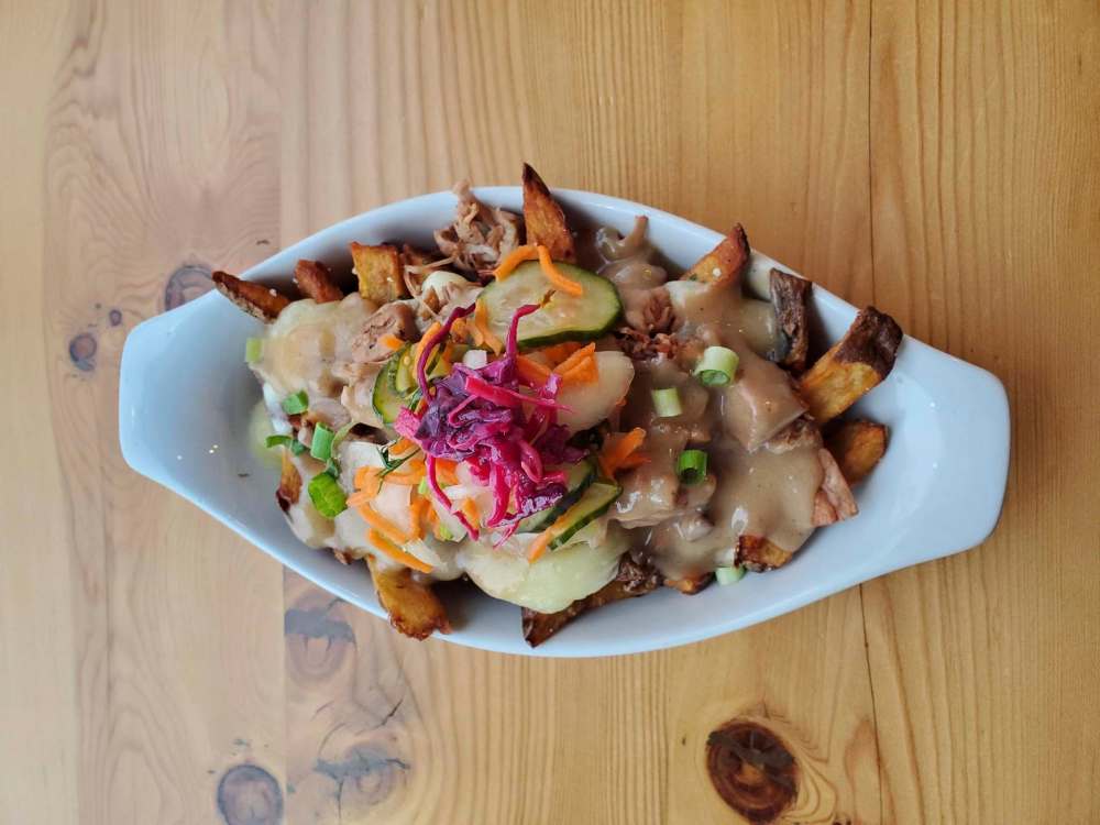 Beer-braised jackfruit, fresh-cut fries with Bothwell cheese curds, beer gravy and house-pickled vegetables. Gluten-free with a dairy-free and vegan option.