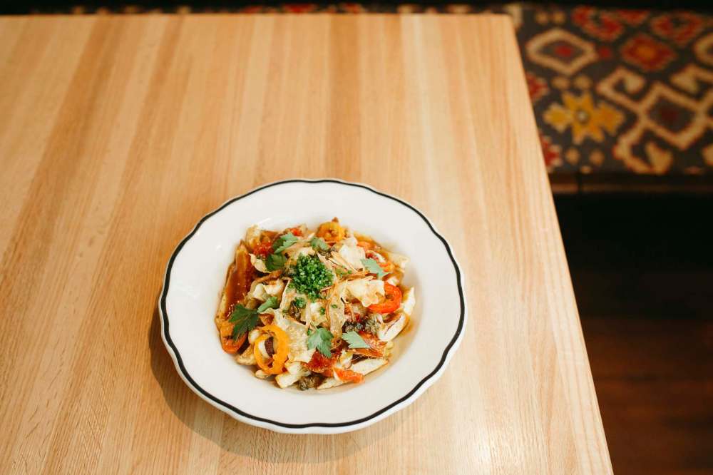 A vegetarian poutine. House-made Kennebec fries, roast allium and porcini mushroom gravy, fried cheese curds, spicy pickled peppers, crispy capers, crispy celery root, crispy shallots and chives.