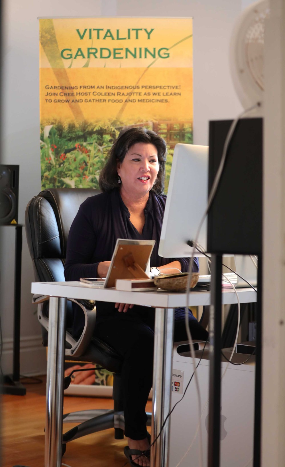 Working from home made sense. In addition to being the director of the Winnipeg Aboriginal Film Festival, Rajotte is the host and producer of Vitality Gardening, a gardening series that ran on APTN and will soon be airing on the California network FNX (First Nations Experience). Since she uses her entire backyard and most of the front for garden (“My yard is my studio.”), it made sense that she uses rooms in her three-storey house for both editing (a bedroom on the second floor) and writing (on the third floor).