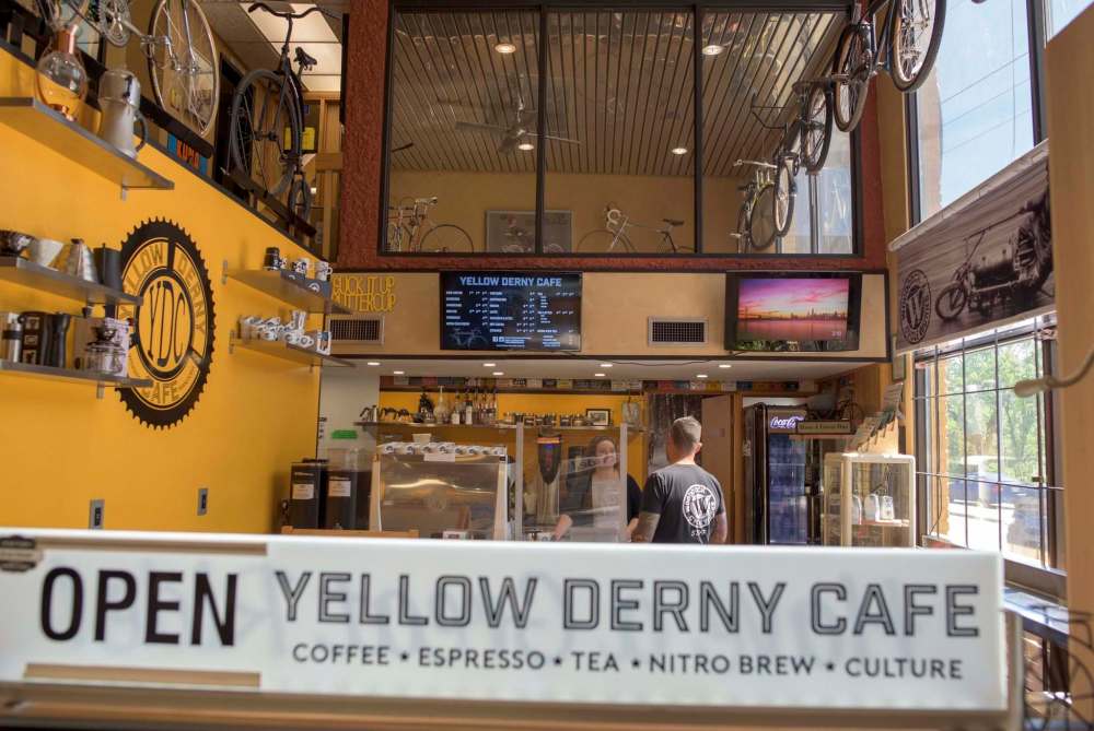 Along with hot and cold drinks, Yellow Derny sells coffee beans and specialty teas from house roaster Caffe Umbria and a rotating selection of indie labels.