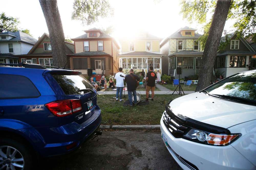 JOHN WOODS / WINNIPEG FREE PRESS Neighbours listen as Double the Trouble performs on the boulevard.