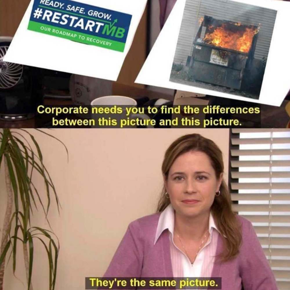 Popular posts riff on meme mainstays like the “Jealous Girlfriend,” in which a man checks out a woman, symbolizing a new idea, while his girlfriend, the neglected idea, stares at him in disgust, and one where The Office’s Pam is asked to detect the difference between a dumpster fire and the “Restart Manitoba” campaign. “They’re the same picture,” she says.