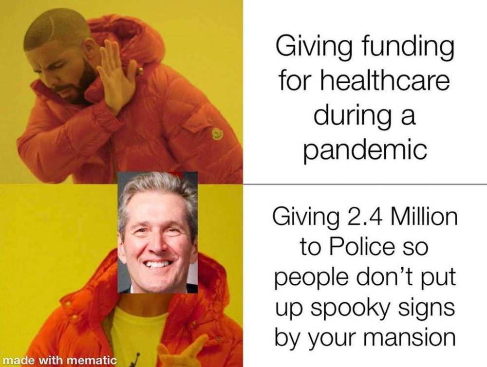 Some popular ones include his take on the Hotline Bling meme, a four-panel grid that shows rapper Drake dismissing one idea, then approving another. In Rude Boy’s version, Drake dismisses funding health care, and Pallister approves increased funding for policing “so people don’t put up spooky signs by your mansion.”
