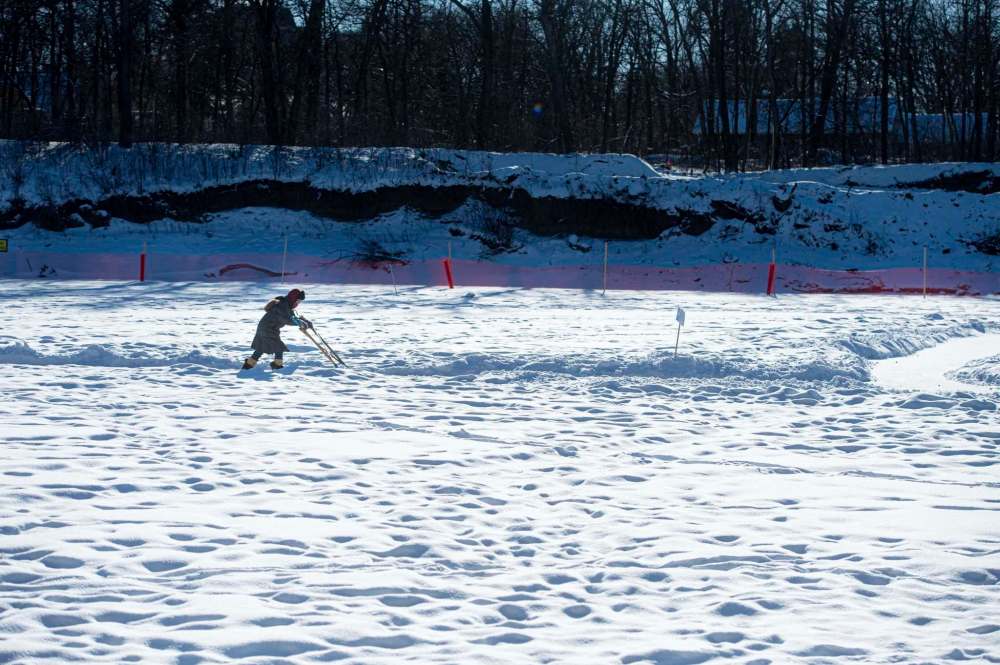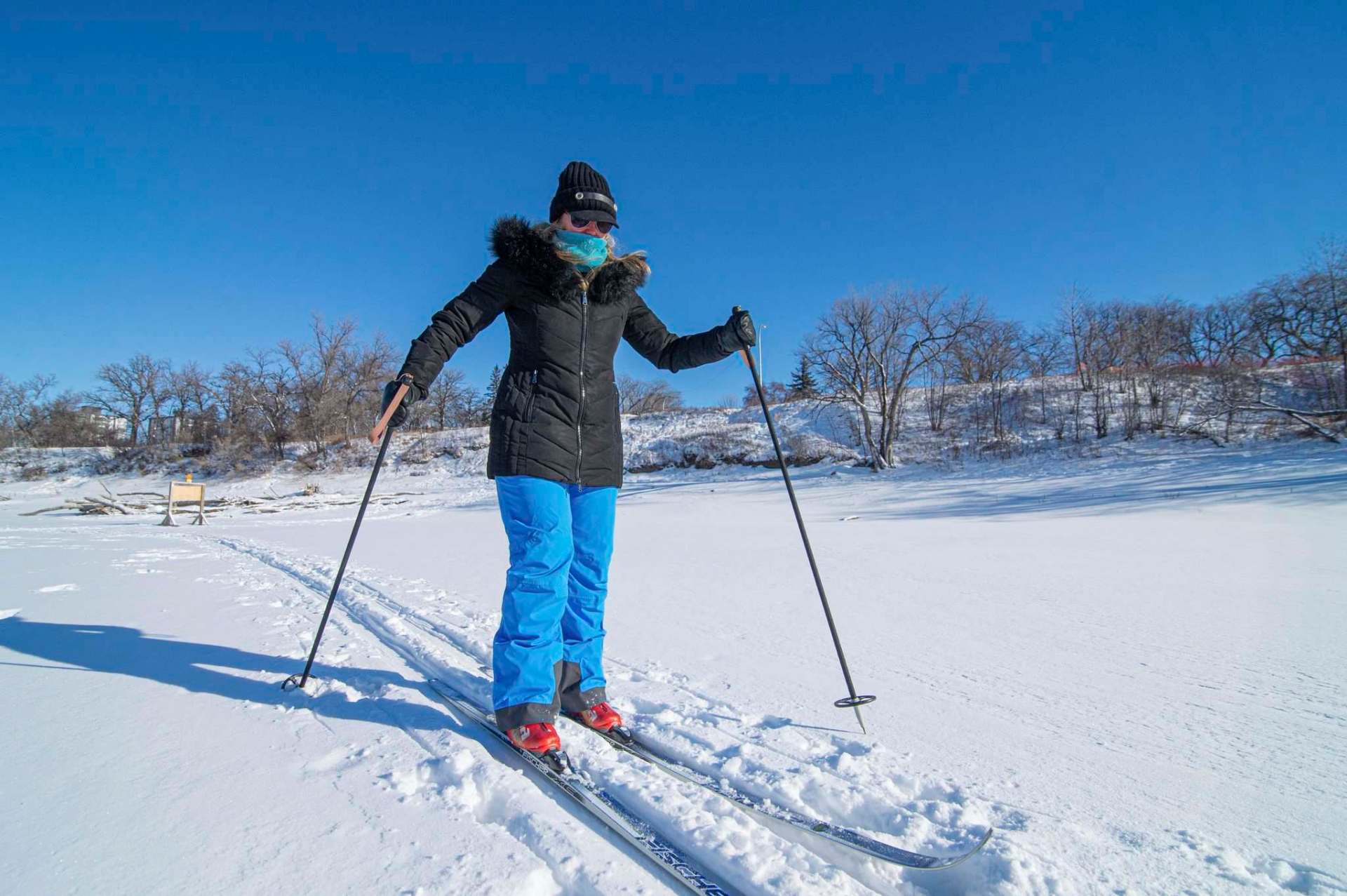 Wendy Van Loon climbs down from the Wellington Crescent side with admirable grace. Wearing a pair of skis she bought on Facebook Marketplace, Pamela Friedrich trudges onward. Wrapped in a hot pink faux-fur coat and matching hat, Laureen Best is visible from two kilometres away.