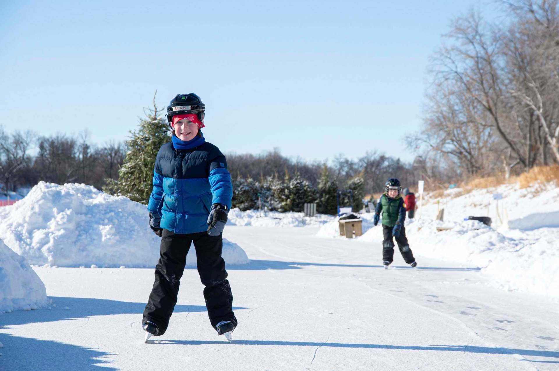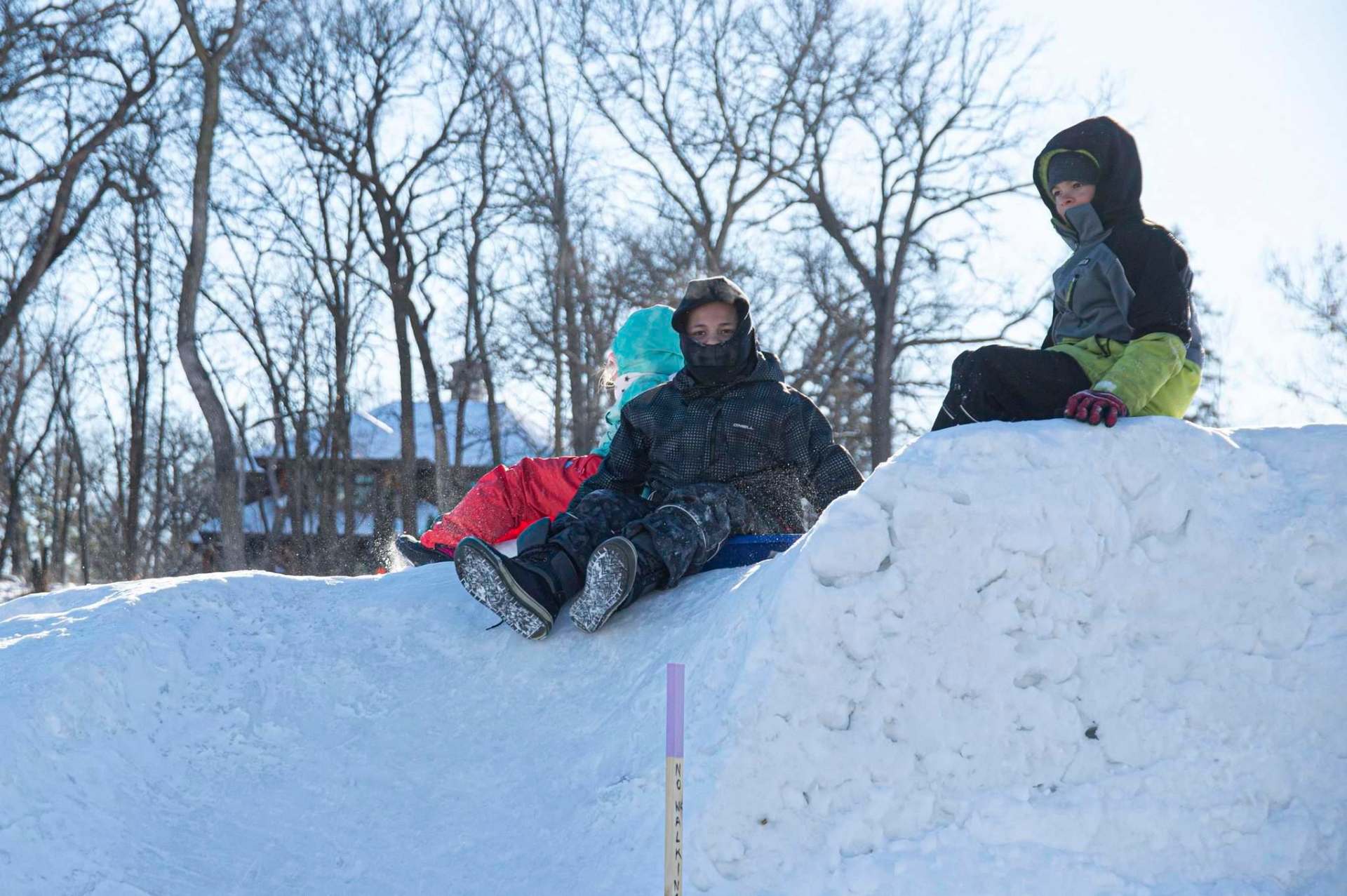 On a nearby toboggan slide, Xander and Hayden Shaw blast across the ice, rolling on the river.