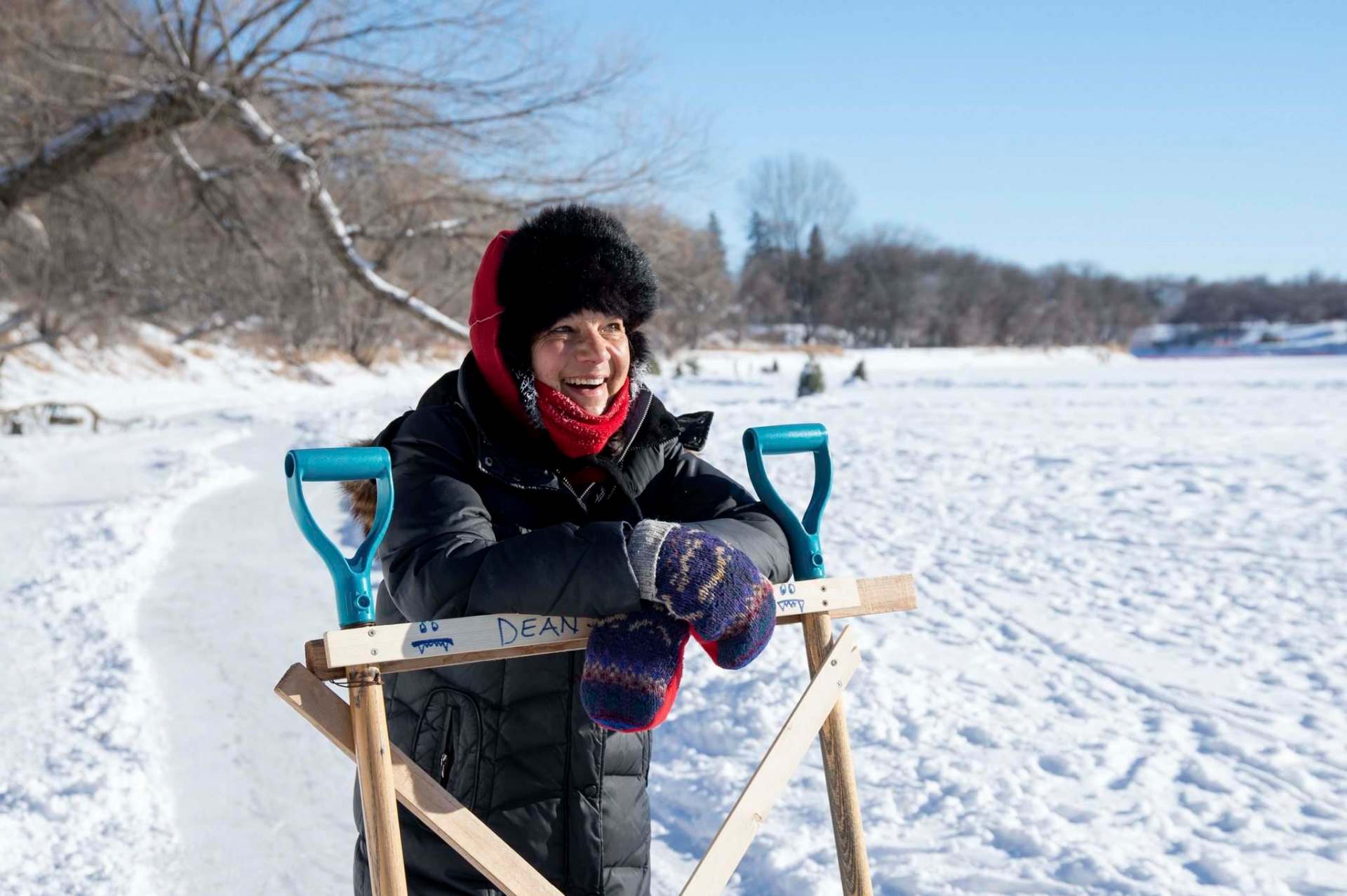Around 11 a.m., Findlay finds what she’s looking for jammed into a snowbank: a pair of robin’s egg-blue shovels slapped together with an X of spare lath and a crossbeam to rest her arms on. “Dean’s Dozer,” the crossbeam reads in all-caps. “Who’s Dean?” Findlay is asked. “Not a clue,” she says.