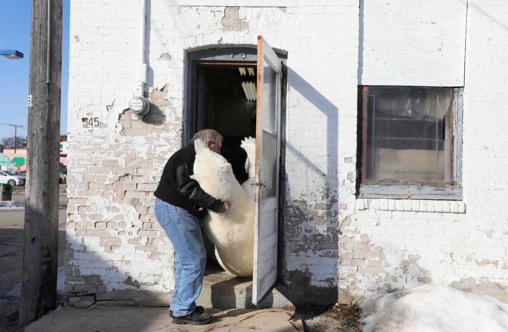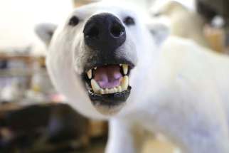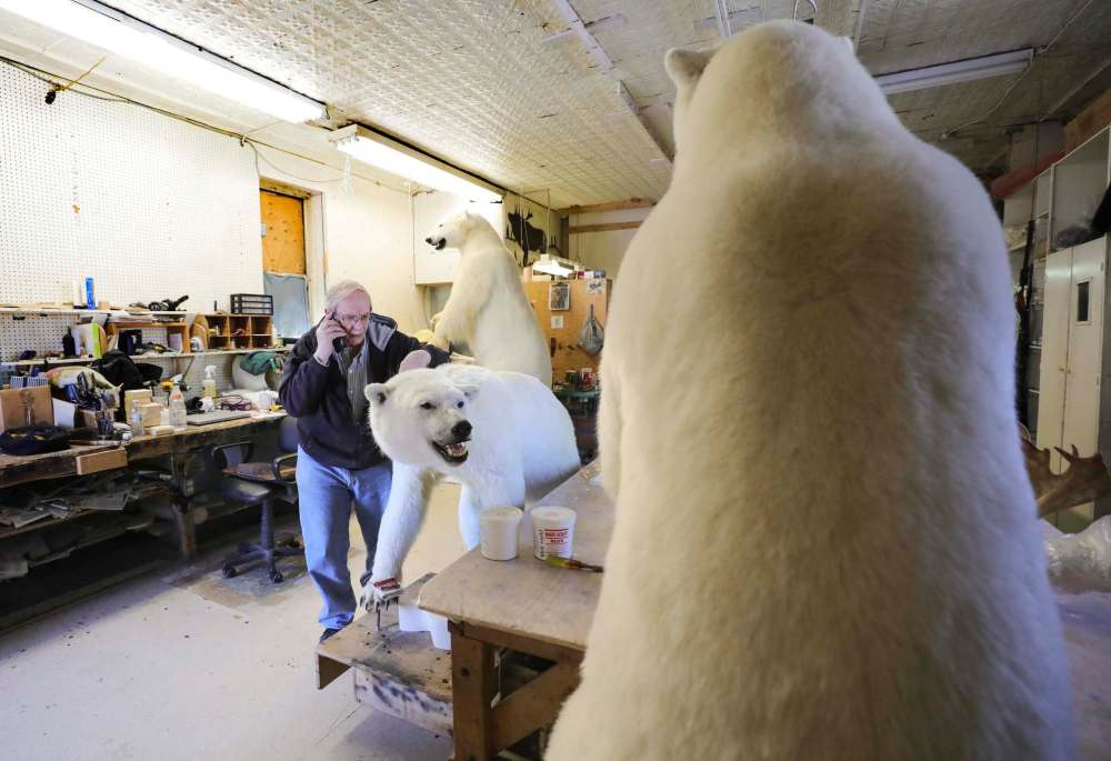 Inside the shop, two female polar bears hold court at the massive work table, and one male towers above Baxter at more than 2.2 metres tall.