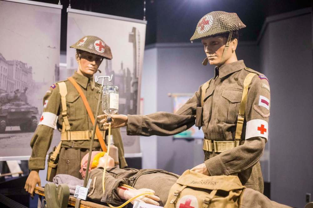 “I think it is a controversial topic,” she says of the exhibition, which features a military rifle, uniforms and mannequins dressed as war-time medics carrying a wounded soldier on a stretcher.