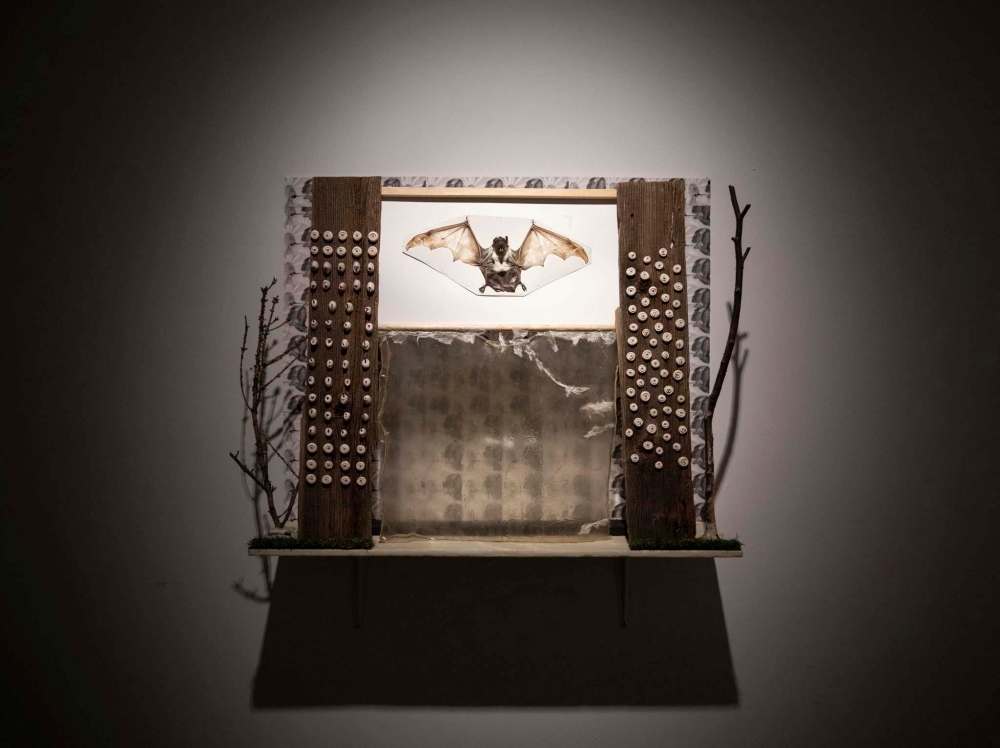 Included with the seven-minute film are the sets Thorneycroft used to create it, 13 desk-sized dioramas festooned with trimmings from evergreens and twigs, or made to resemble laboratories, dotted with small animal skeletons on their walls.