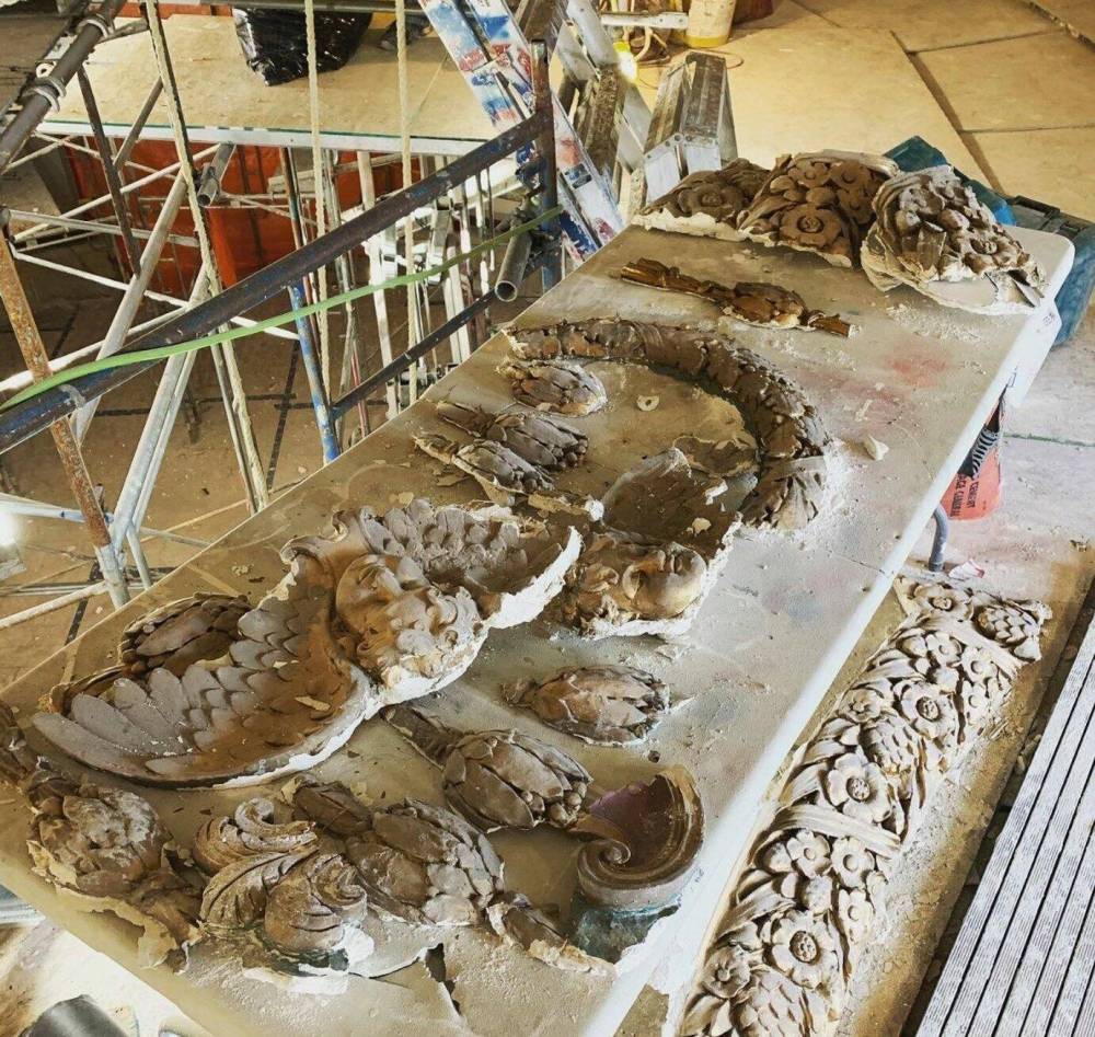 The repair process involved making plywood jigs roughly in the shape of the damaged parts of the ceiling. They’re then flipped upside down and a rubber mould based on a similar but undamaged portion of the ceiling is created. Plaster is poured into the mould; once it sets, everything’s carefully flipped over so the plaster can be raised and attached to the ceiling.