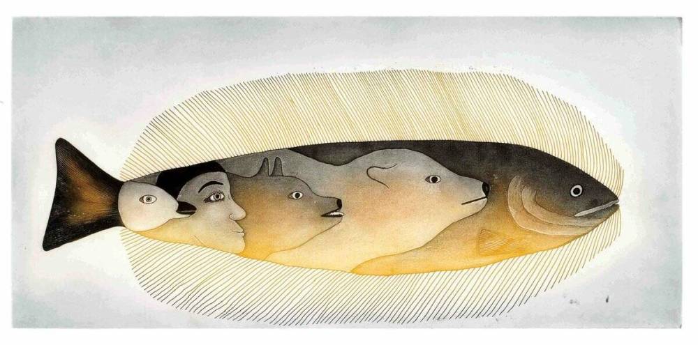 There is Cree art, such as Jerry Whitehead’s Wake Up and Inuit art, such as Mialia Jaw’s Ancient Vision, that build on ancient cultural traditions to tell stories that were told thousands of years before this place was ever called Canada. There’s the Ukrainian Christmas Eve by William Kurelek, and the Trans-Canada Highway by Peter McConville. There’s Mary Pratt’s painting of an aluminum-foil-wrapped Christmas turkey.