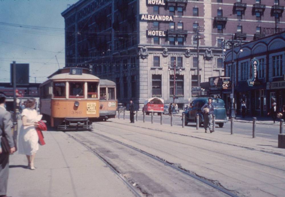 “Then #374, with its painted-on tears on the front windows, lurched forward. A quiet hush fell over the assembled gathering as they watched the four cars go around the corner of Portage and Main and head north out of view,” Darragh recalled in writing 60 years later. “Some of the several thousand people who witnessed these proceedings shed a few real tears for the great service the streetcars had given over their 73 years.”