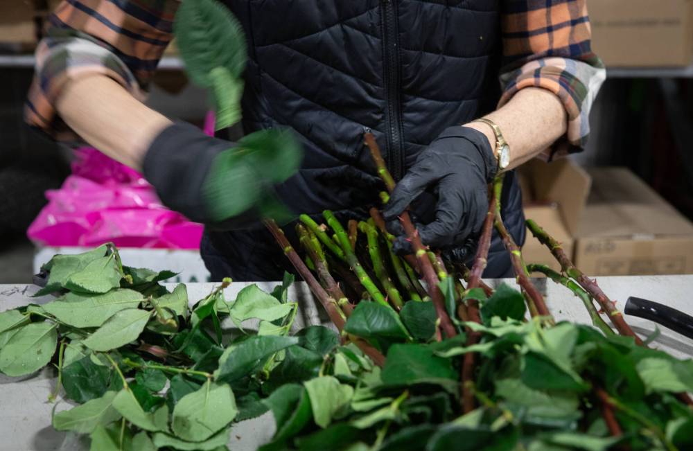 JESSICA LEE / WINNIPEG FREE PRESS From left, Joan McCorrister, Cathy MacKinnon, Andrea Cibinel and Suzanne Du Plooy, volunteers for the Winnipeg Art Gallery, remove thorns from flowers to be used in bouquets at Petals West.