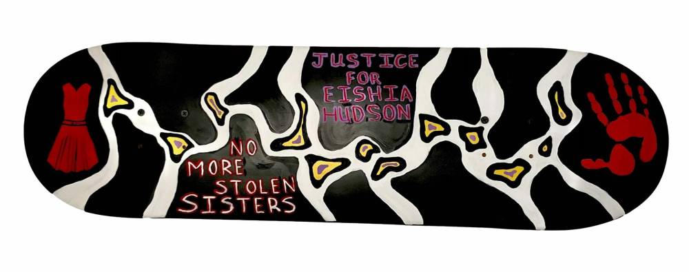 Kid Radish turned their deck into a joyful sun wearing sunglasses. Catherine Cormier’s creation blends music and skateboarding with a funky flair. And William Hudson’s draws attention to the tragedy of violence against Indigenous women and girls; his daughter Eishia was shot and killed by a member of the Winnipeg Police Service in April 2020 at the age of 16.