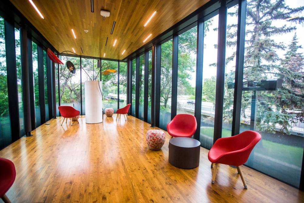 MIKAELA MACKENZIE / WINNIPEG FREE PRESS A view of the river from inside the recently added glass-and-steel addition of the newly renovated Cornish Library.