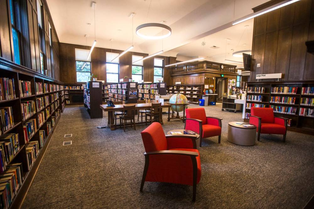 The Cornish Library, which opened officially in June 1915, calls up the early 20th-century history of the public library with the solid, sober red brick of its exterior and the lofty ceilings, high windows and handsome oak and walnut trim of its symmetrical interior. Its sturdy wooden library tables were constructed to be piled high with the heavy books of serious scholars.