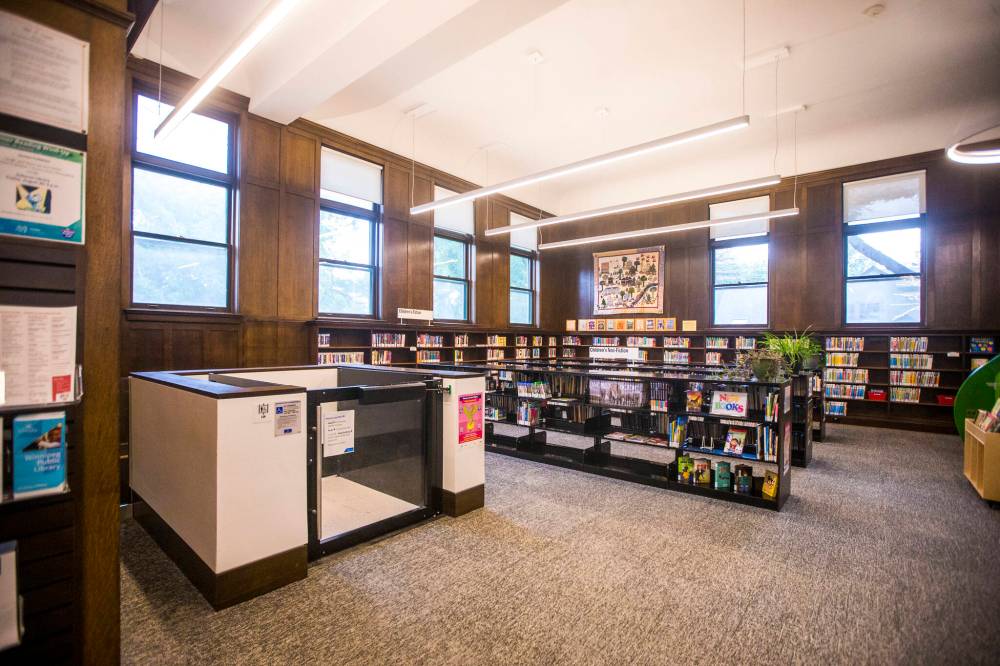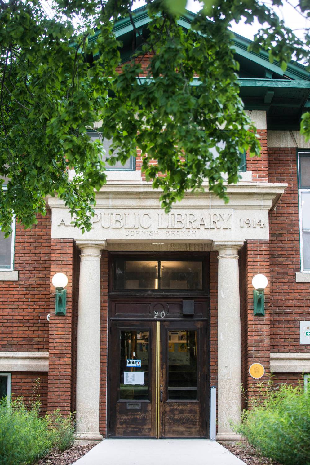 The Cornish Library, designed by local architect S. Frank Peters, consists of one main storey with a raised lower level that was used for lecture series and meetings. Its central entrance is framed by Tuscan columns, the most unadorned of the classical orders, and topped by a modest triangular pediment. The interior plan also reflects Carnegie ideals. “When you go in the main entrance, you go up the stairs and there is an open space with a reading area, and — this is really important, too — there’s a substantial area of the floorspace devoted to children,” Dudley states.