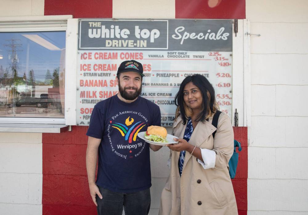 JESSICA LEE / WINNIPEG FREE PRESS Winnipeg Free Press reporters Ben Waldman (left) and AV Kitching at the White Top, where the fat boy set them back about $3.50 each.