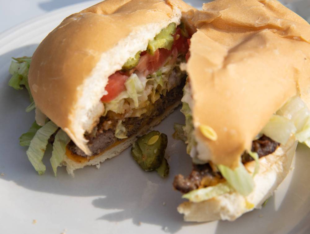 It’s a heap of finely shredded lettuce on top of a patty blanketed with chili, one thick slice of tomato and a slice of cheese at the bottom, all held together inside a sturdy white bun from family-run Harvest Bakery.