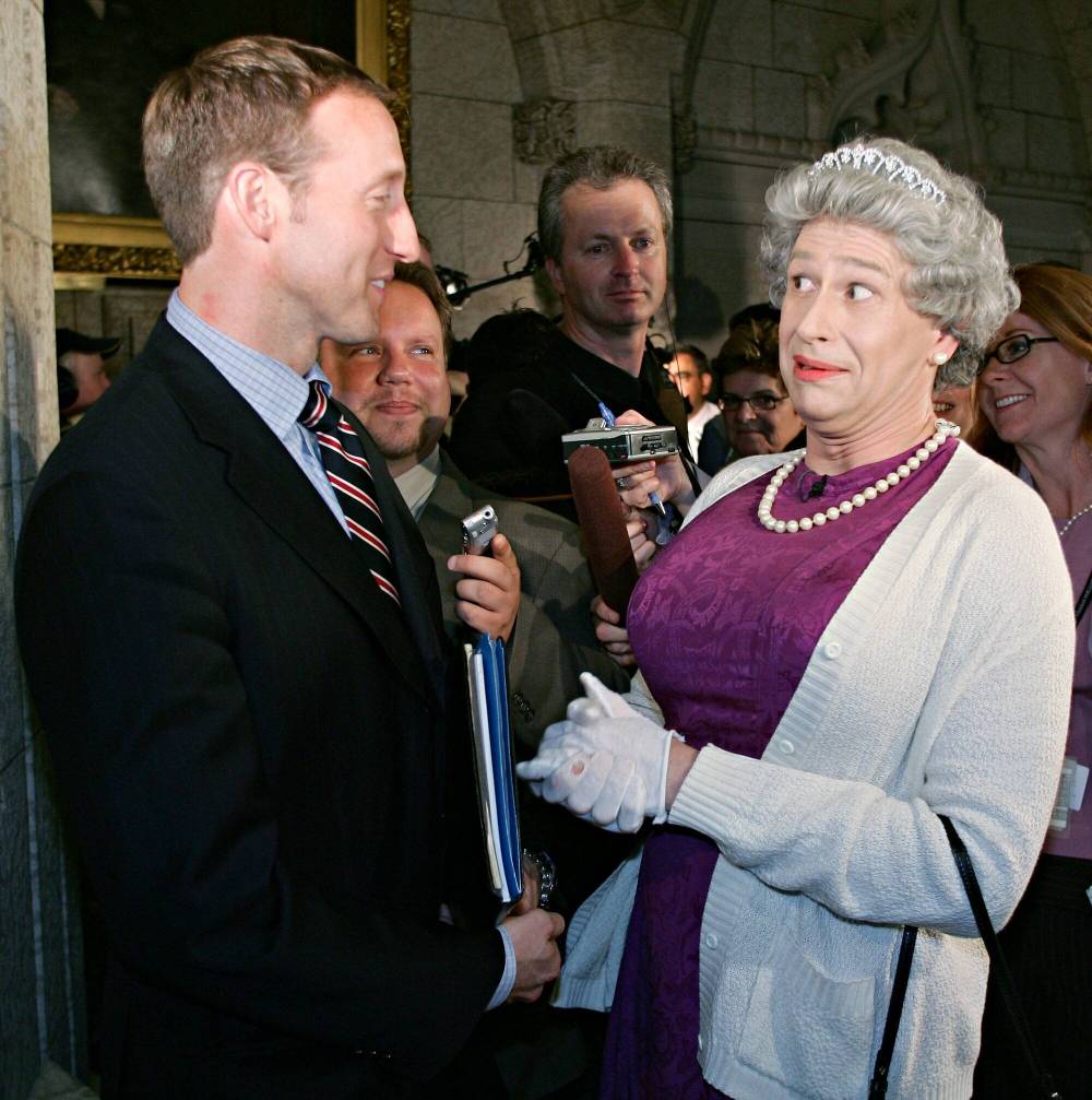 Former Conservative MP Peter MacKay (left) speaks with actor Scott Thompson, dressed as Queen Elizabeth II in 2005.