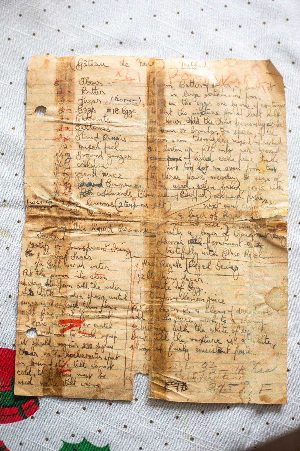 MIKAELA MACKENZIE / WINNIPEG FREE PRESS A battered and much-loved handwritten copy of the fruitcake recipe, which dates back to the 1800s and has been a longtime Christmas and wedding tradition.