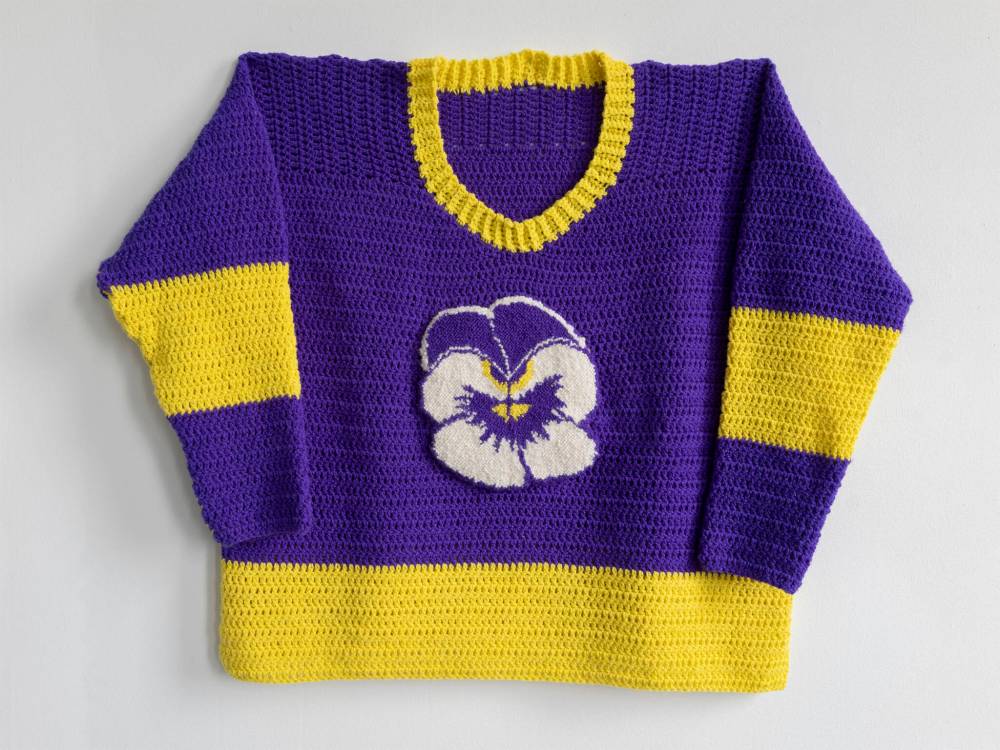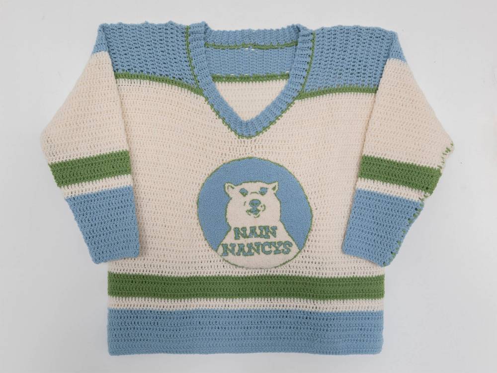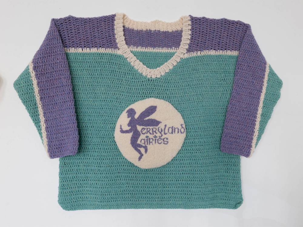 Morneau crocheted and rug-hooked the brightly coloured, vintage-inspired jerseys — complete with logos — for all 14 of the QNHL’s teams, which are all named for pejoratives used against LGBTTQ+ communities in an act of reclamation.