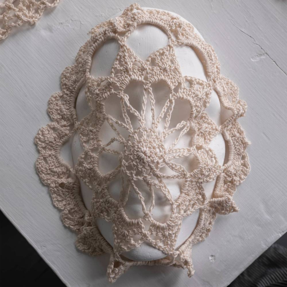 Morneau crocheted goalie masks, fashioned to look like doilies, as a reference to the way face protection was ridiculed when it was first introduced to hockey.