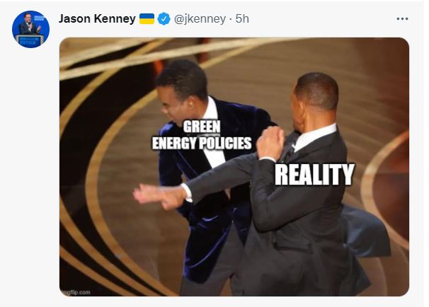 EDMONTON – Alberta Premier Jason Kenney is defending the use of a meme from the Oscars as a contemporary way to draw attention to what he considers failing green energy policies.