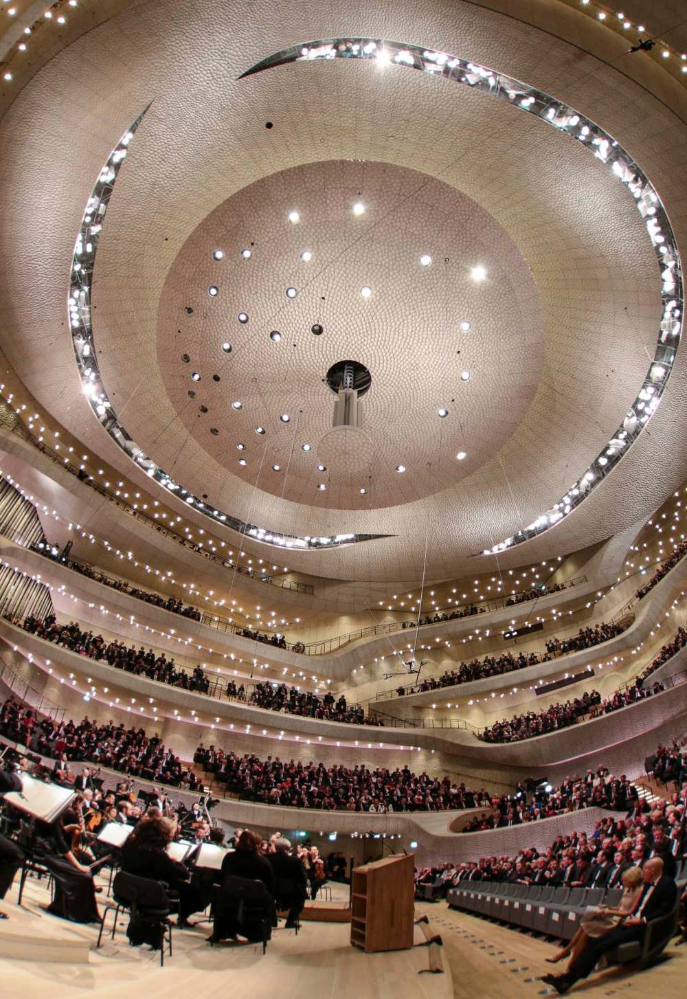 Often, architects and critics stress the “democratic” or egalitarian virtues of vineyard-style seating, though the peculiar height of the Elbphilharmonie makes the lower seats, closest to the orchestra, more equal than others, especially the highest ones, which can inspire vertigo. It’s not a democratic seating plan with all seats being equal, but it is one that fosters an exciting sense of community during performances.
