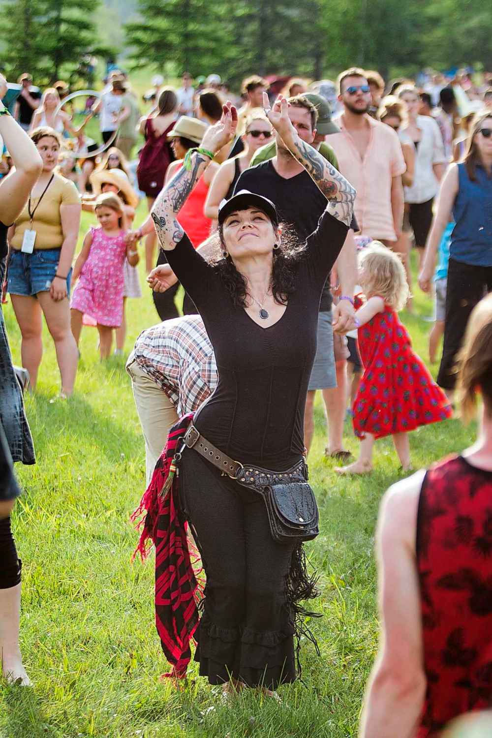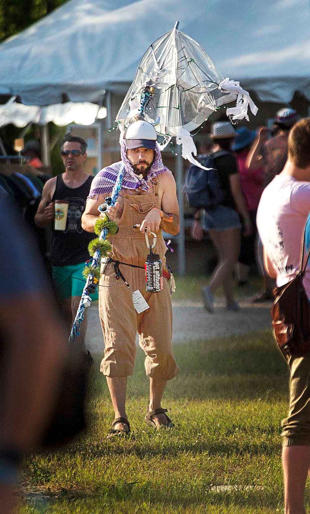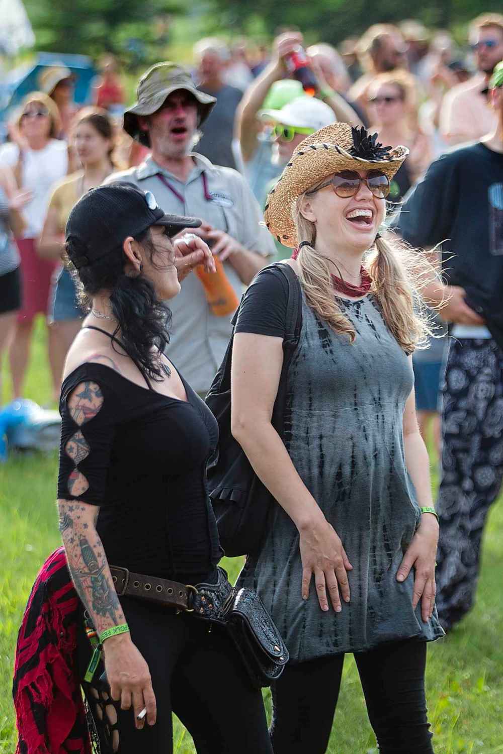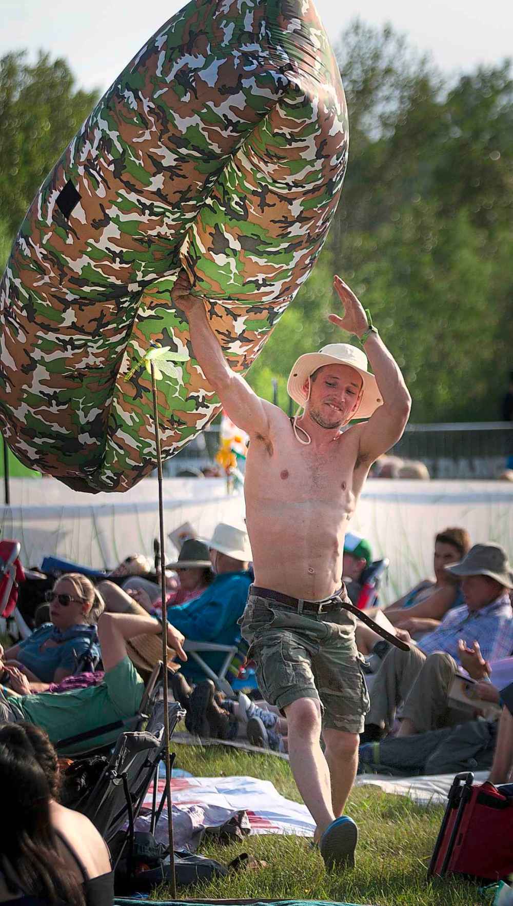 Inside the festival gates, another reunion was taking place in the queue for the tarp shuffle — a daily event in which folks walk, skip and waddle to claim a spot for their tarp in the main stage seating area.