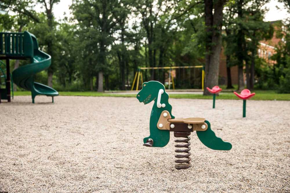 On the park’s northern edge, it bends down toward the river. Near where it bends, a boy stands in the splash pad in shorts and a T-shirt, face turned up to the fall of water that splashes over his eyes. Nearby, another child kneels in a sandbox. Off to the side, a trio of kids reluctantly come off the swings as their father coaxes them home.