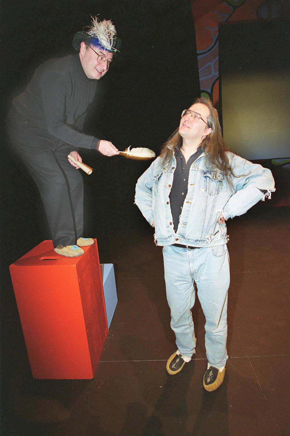 Ian Ross (right) and actor David Warburton on the set of MTYP’s The Illustrated History of the Anishnabe in 2001.