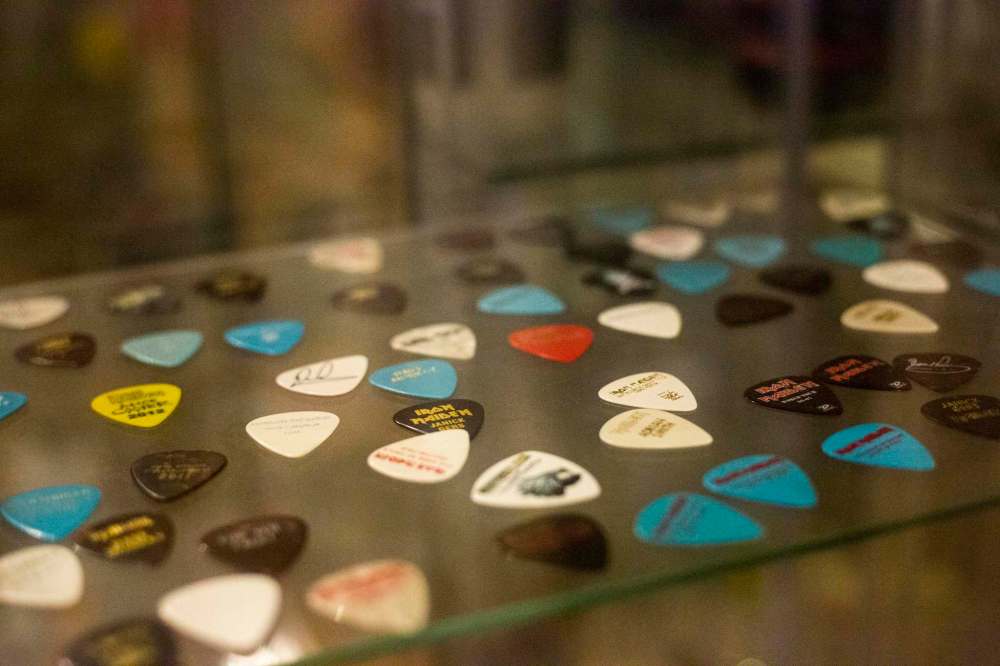 A few steps away from his photo exhibit is a presentation wholly dedicated to Iron Maiden’s 1979 debut EP, The Soundhouse Tapes. Only 5,000 copies of the three-track, seven-inch record were released and Maxymowich owns close to 40 of them. Keep going and you’ll come across treasures as small as guitar picks and as large as, well, guitars. Mounted on one wall directly above an Iron Maiden poker table, which rests next to an Iron Maiden pinball machine, which rests next to an Iron Maiden billiards table, is a scarlet red axe, the same one Adrian Smith, who joined the band in 1980, played during their 1982 tour of Japan.