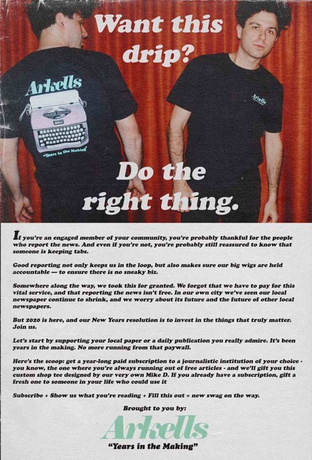 "Somewhere along the way, we took this for granted," the band posted on its website. "We forgot that we have to pay for this vital service, and that reporting the news isn’t free. In our own city we’ve seen our local newspaper continue to shrink, and we worry about its future and the future of other local newspapers. But 2020 is here, and our New Years resolution is to invest in the things that truly matter. Join us."