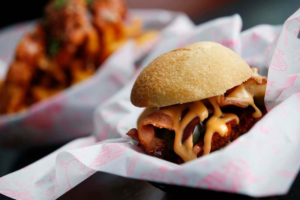 Tasty, fall-apart-ish chicken on a bun options include the Cheese Wizard, battered chicken gussied up with pickled jalapeños, thick cheese sauce and bacon. There are also wings (not sampled), both dry and saucy.