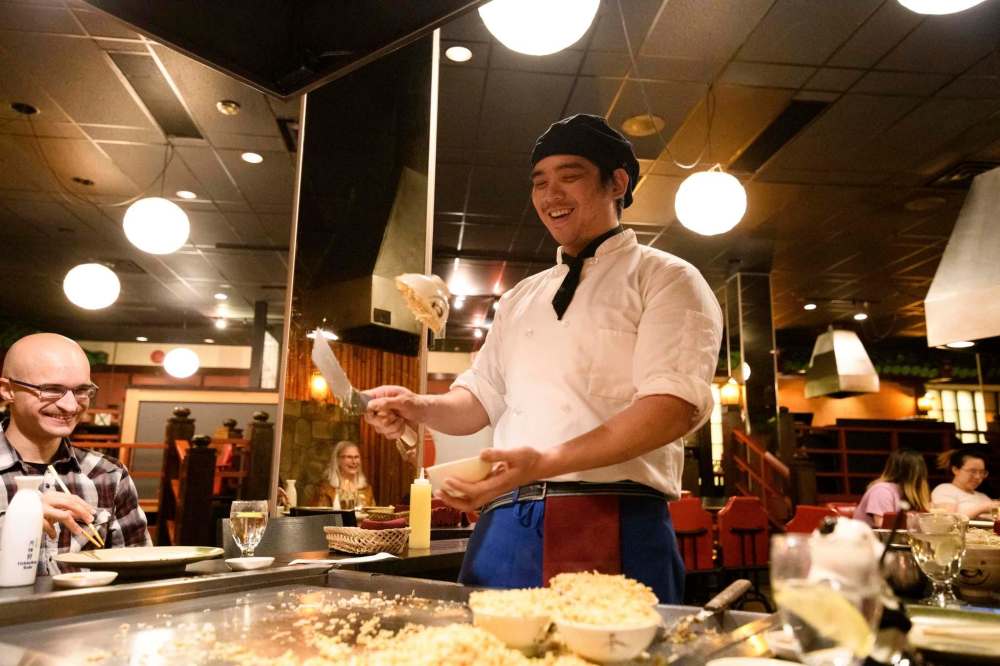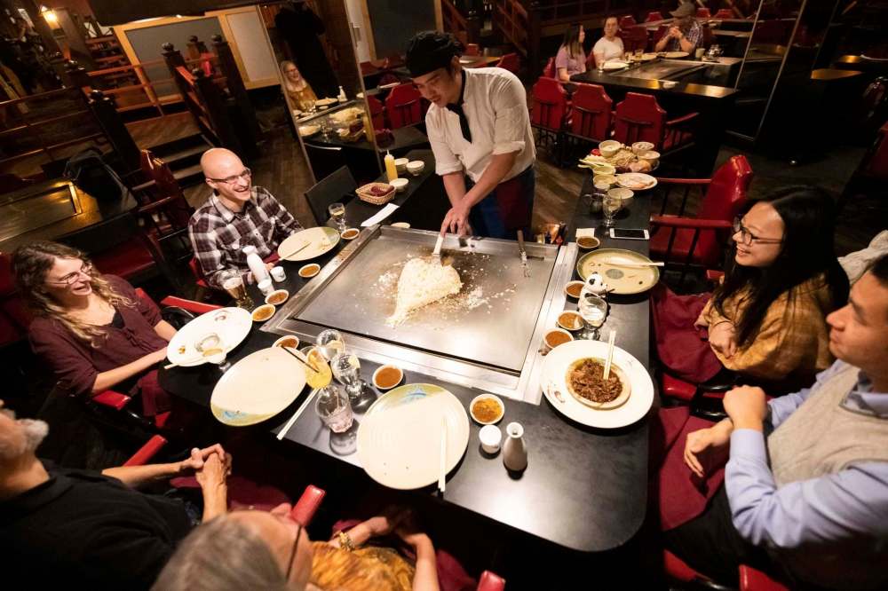 Depending on the size of your group, you may be asked if you’re willing to sit with another party. While North Americans sometimes find communal seating awkward, the teppanyaki experience encourages a loosened-up, friendly atmosphere. There’s something about listening to corny jokes and catching eggs — not to mention sake bombing — that gets people chatting.