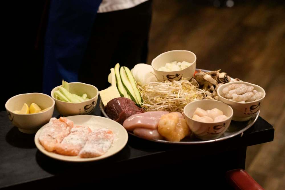 Reached via a set of outdoor stairs that descend from Carlton Street, the resto’s plain, heavy doors open into a huge multi-levelled space. A wooden bridge leads to a lower level, where crimson seats are grouped around large, flat, iron griddles. The decor, a little rundown in spots, calls up the immersive, “exotic” dining environments popular in the 1960s and ’70s. There’s a casual bar, as well as a quieter area of table seating removed from the main action for people who want a less interactive meal. Apart from the full teppanyaki-style dinners, the menu also offers à la carte sushi, tempura and snacks.