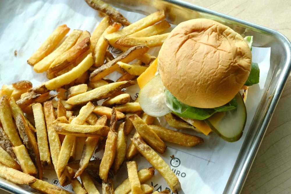 Along with the classic beef burger, there are chicken and plant-based options. Fries are also good, medium-thick-cut and salted just right.